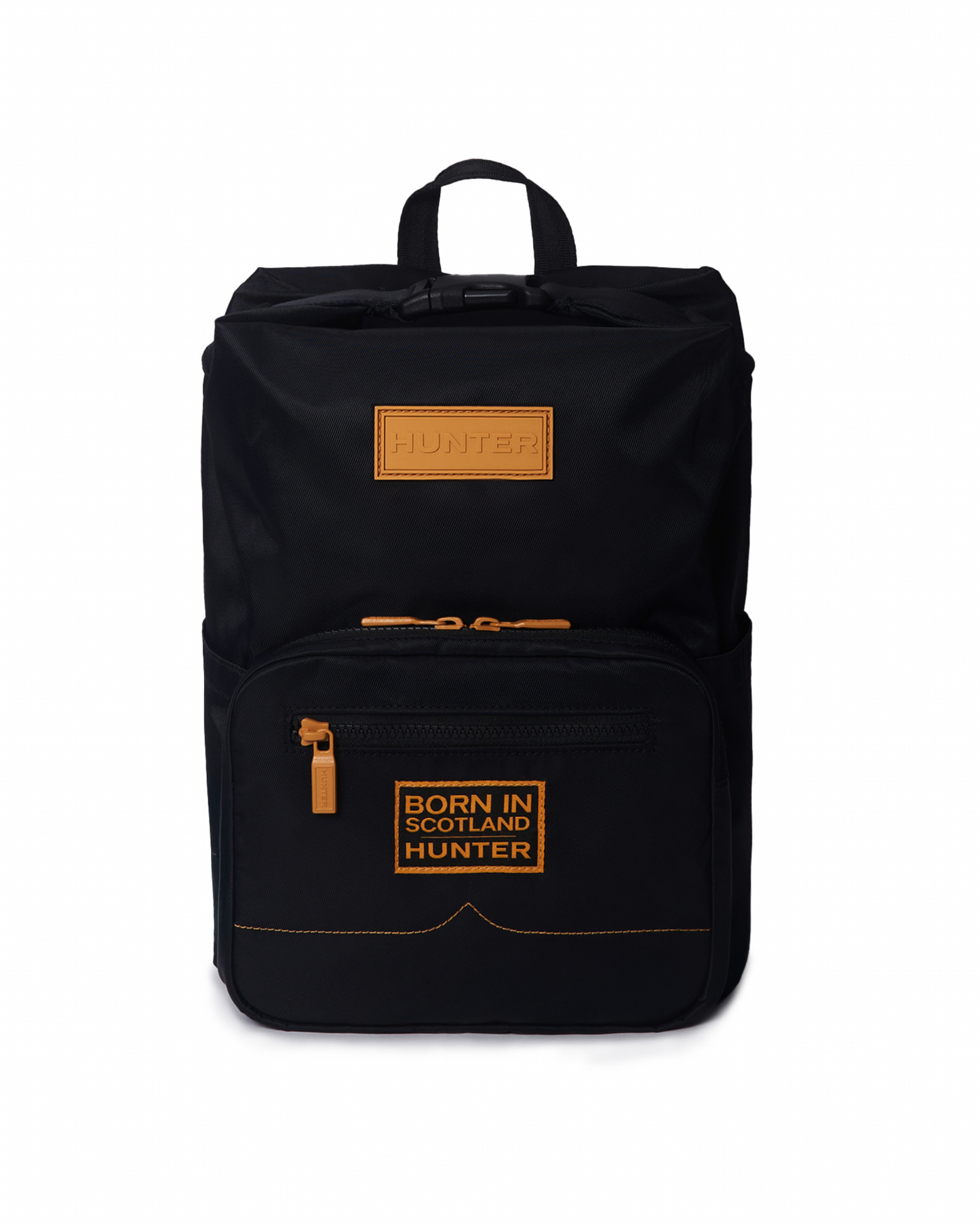 The classic Nylon Pioneer Medium Top Clip Backpack is adorned with the "BORN IN SCOTLAND" tag, which symbolizes the origin of Hunter. It has a water-resistant recycled nylon exterior and a recycled polyester lining. The capacity is 13 liters. On the front of the bag, there is a zipped multifunctional pocket that can be used to sort and store cards and pens. The back is made of Hunter brand mesh fabric for increased comfort and breathability. Padded strap with adjustable length and side pockets for closure.